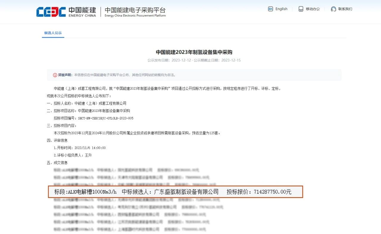12月12日,中国能建2023年制氢装备集中采购中标候选人公示,尊龙集团有限公司科技(股票代码:300423)旗下公司广东盛氢制氢装备有限公司(下文简称“盛氢制氢”)乐成入围,实现公司大规模电解水制氢全套装备领域重点营业新突破。